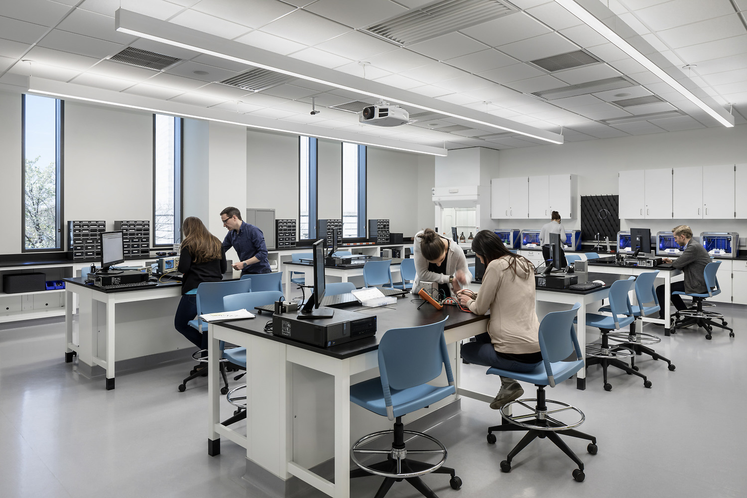 The newly constructed, 106,735-square-foot facility stands four stories into the Camden skyline, complementing its neighbor, City Hall. Rutgers–Camden students at the undergraduate and graduate levels are engaging in learning experiences with Rutgers research faculty in state-of-the-art classrooms and clinical and research lab spaces.