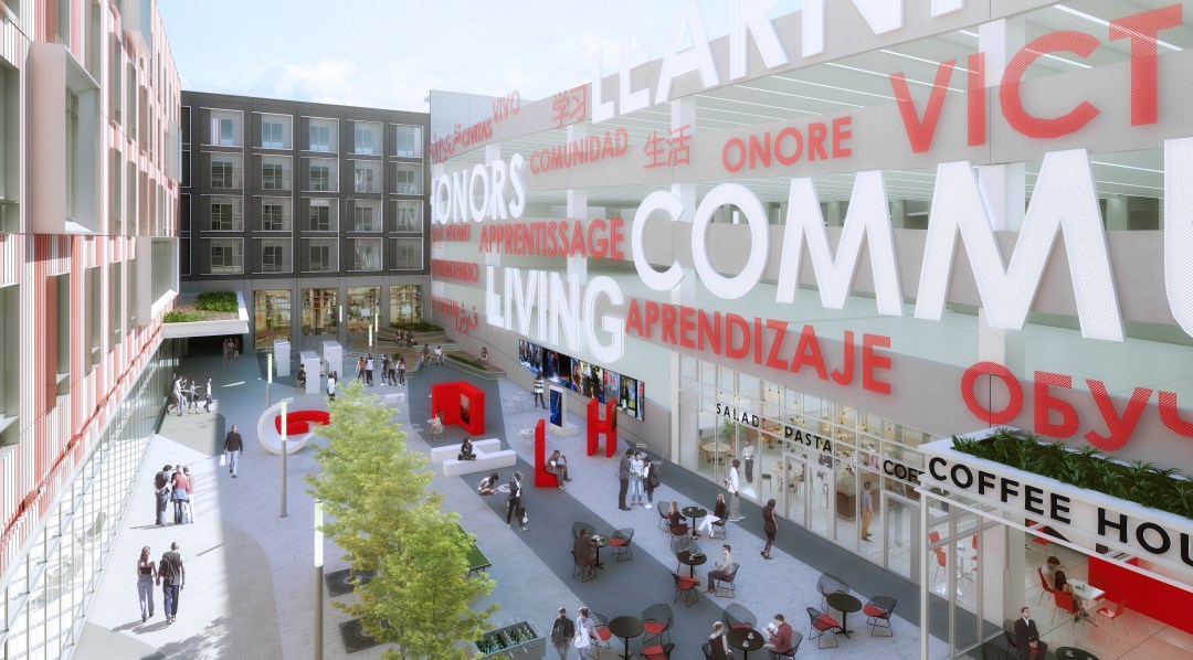 This unique five-story building is an approximately $70 million, 400-bed Honors Living-Learning Community will be a mixed-use development that will include residences, academic space, classrooms/work spaces, street level retail and parking, as well as a vibrant, open space that will be a gathering place for RU-N and the surrounding community. The estimated 320,000-square-foot project will include 30,000 square feet of ground floor retail. Additional features will include a parking garage and an outdoor public piazza designed by ICRAVE. It is located on the block bounded by New, Washington, Halsey and Linden Streets in downtown Newark.